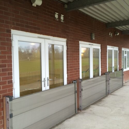 Installation of two 2.4m H demountable aluminium flood barriers to the Essex County Cricket Ground on behalf of KIER Construction in July 2015.